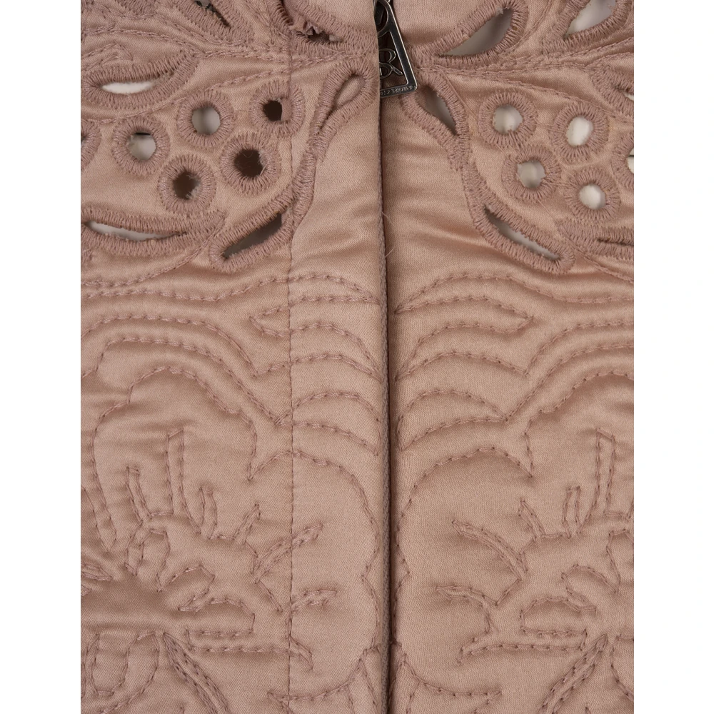 Ermanno Scervino minirok gemaakt van roze zijdesatijn en versierd met een gewatteerd bloemenpatroon. De binnenvoering is gemaakt door het satijnen stof te verdubbelen, terwijl de sluiting een metalen rits aan de achterkant is. De randen volgen het borduurontwerp. Maatbereik: Italiaanse dameskleding.