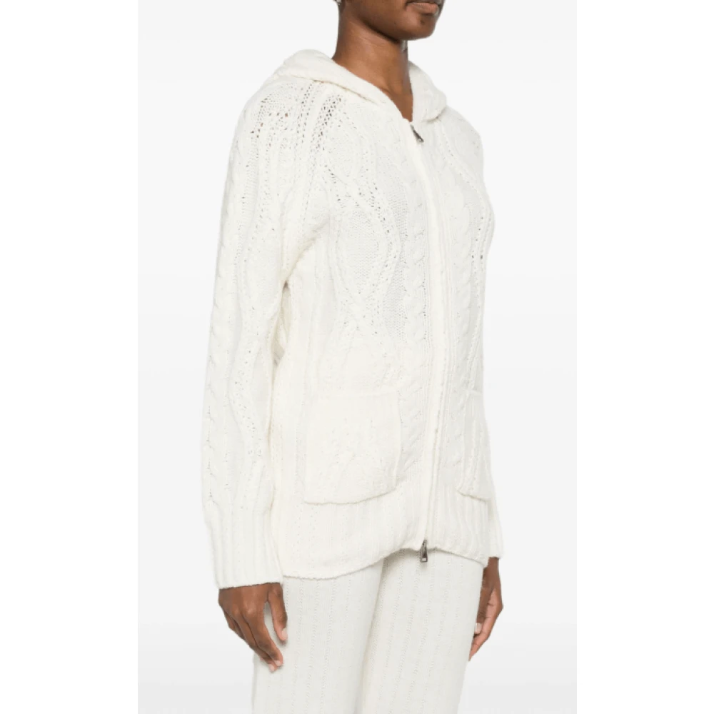 Blijf gezellig en stijlvol met deze witte Ermanno Scervino cardigan voor vrouwen. Voorzien van een tweewegritssluiting aan de voorkant, twee voorzakken, geribbelde manchetten en zoom, en een klassieke capuchon. Gemaakt van een luxueuze mix van glas, merino, viscose, kasjmier, polyamide, messing en polyester.