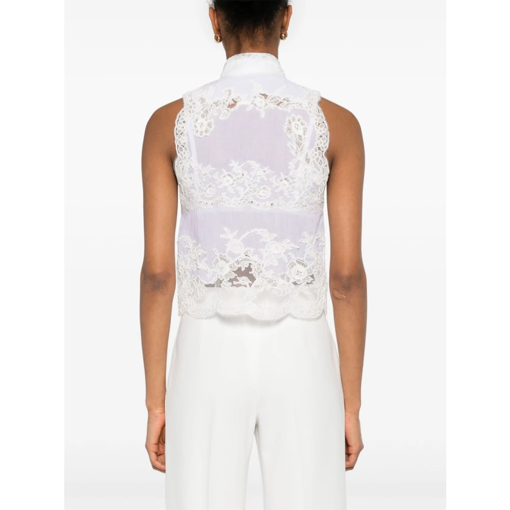 Mouwloze blouse van Ermanno Scervino gemaakt van zuivere katoenen mousseline in witte kleur met Valenciennes kant details. Voorzien van een klassieke kraag, knoopsluiting aan de voorkant en geschulpte zoom. IT-maat; de aangegeven maat is die op het productlabel. Reguliere pasvorm, true to size.