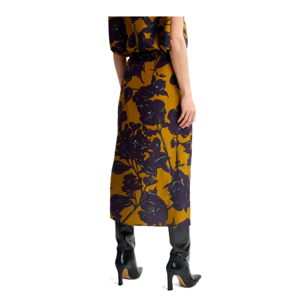 Upgrade je stijl met de Glavia rok van Essentiel Antwerp. Gemaakt van bronskleurige zijde met een prachtig blauw bloemenpatroon, deze midi-rok heeft een verborgen ritssluiting, draperend detail aan de voorkant en een flatterende hoge taille. Gemaakt van 100% zijde met een 100% viscose voering. Model is 177 cm lang en draagt maat S.