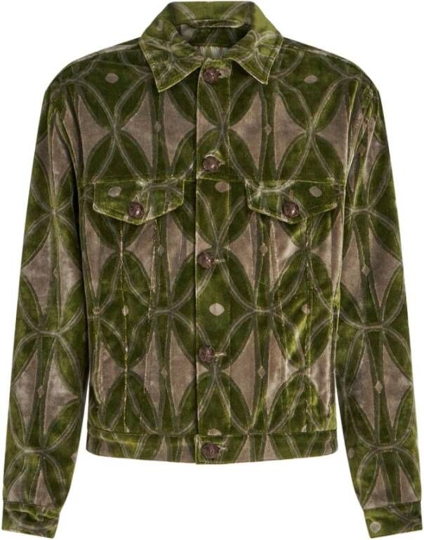 Upgrade je garderobe met deze stijlvolle fluweelachtige jacquard jas van Etro. Ontworpen voor mannen, heeft deze lichte jas een unieke avocado groene en bruine grafische print over de hele jas. Het is voorzien van een klassieke kraag, lange mouwen en decoratieve knoopdetails. De knoopsluiting aan de voorkant, de knoopmanchetten en de borstklepzakken voegen functionaliteit toe aan dit modieuze stuk. Maak je look compleet met deze jas met rechte zoom die elegantie uitstraalt. Verhoog je stijl met Etro