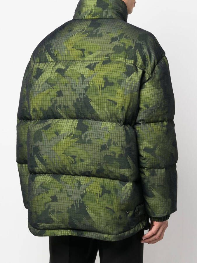 varengroen donsvoering camouflageprint trechterhals gewatteerd design drukknoopsluiting en rits aan de voorkant lange mouwen steekvakken aan de zijkant