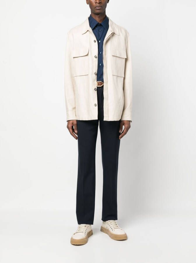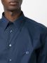 Blauw, geborduurd logo op de borst, klassieke kraag, knoopsluiting aan de voorkant, lange mouwen, knoopmanchetten en afgeronde zoom.