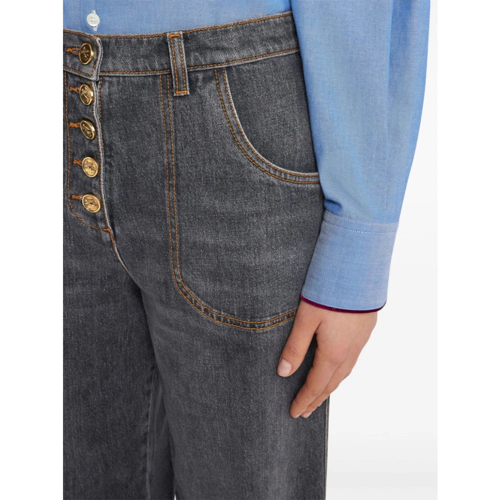 Upgrade je denim look met deze Etro wide leg jeans in grijs stretch-katoen denim. Met contraststiksels, riemlussen, logopatch aan de achterkant, knoopsluiting aan de voorkant, mid-rise pasvorm en klassieke vijf zakken voor een stijlvolle en comfortabele uitstraling.