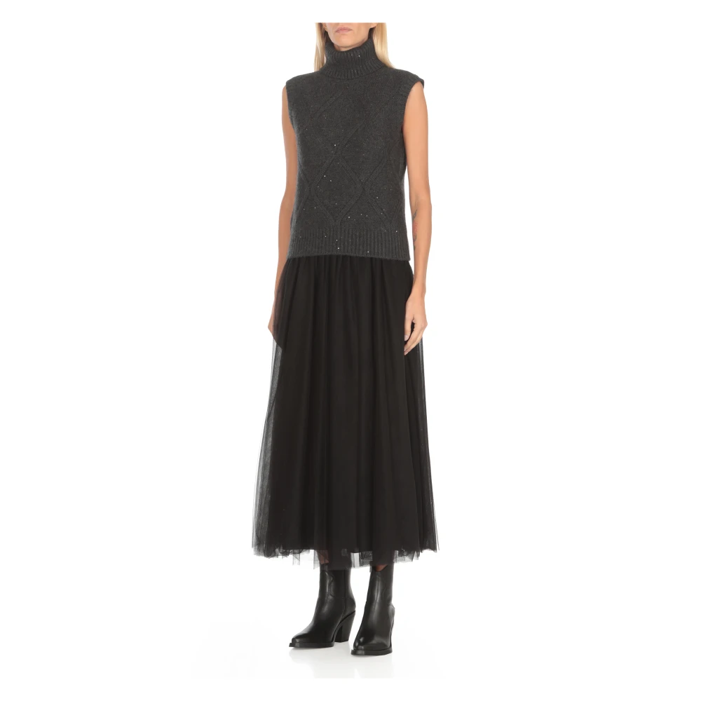 Upgrade je stijl met deze donkergrijze Fabiana Filippi turtleneck trui van maagdelijke wol voor vrouwen. Met een hoge hals, mouwloos ontwerp en pailletten details overal is deze trui een chique toevoeging aan je garderobe. Het model is 179 cm lang en draagt maat 40.