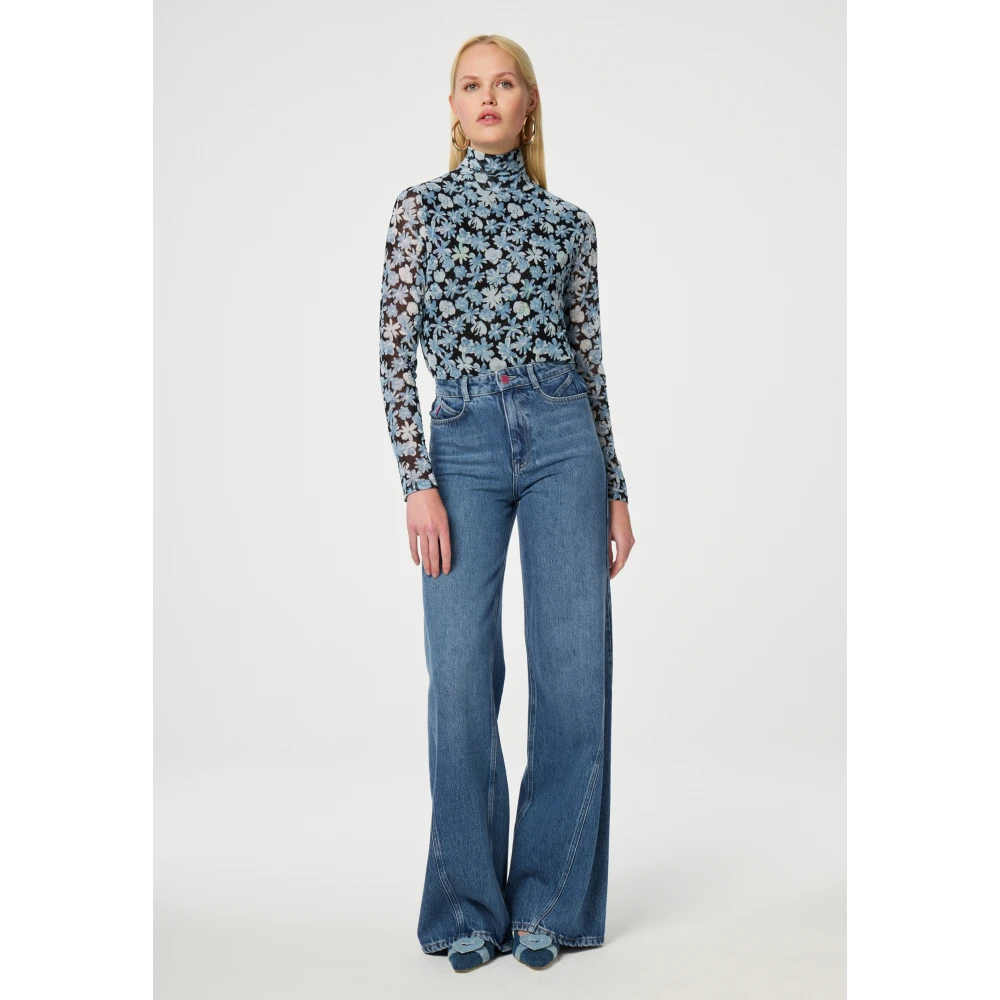 Deze dames-top met lange mouwen, een hoge hals en een blauwe bloemenprint is perfect voor elke gelegenheid. Gemaakt van 84% gerecycled polyester en 6% elastaan, biedt hij een getailleerd silhouet. Combineer hem met onze Bonnie Wide Leg Jeans voor een casual maar stijlvolle look.
