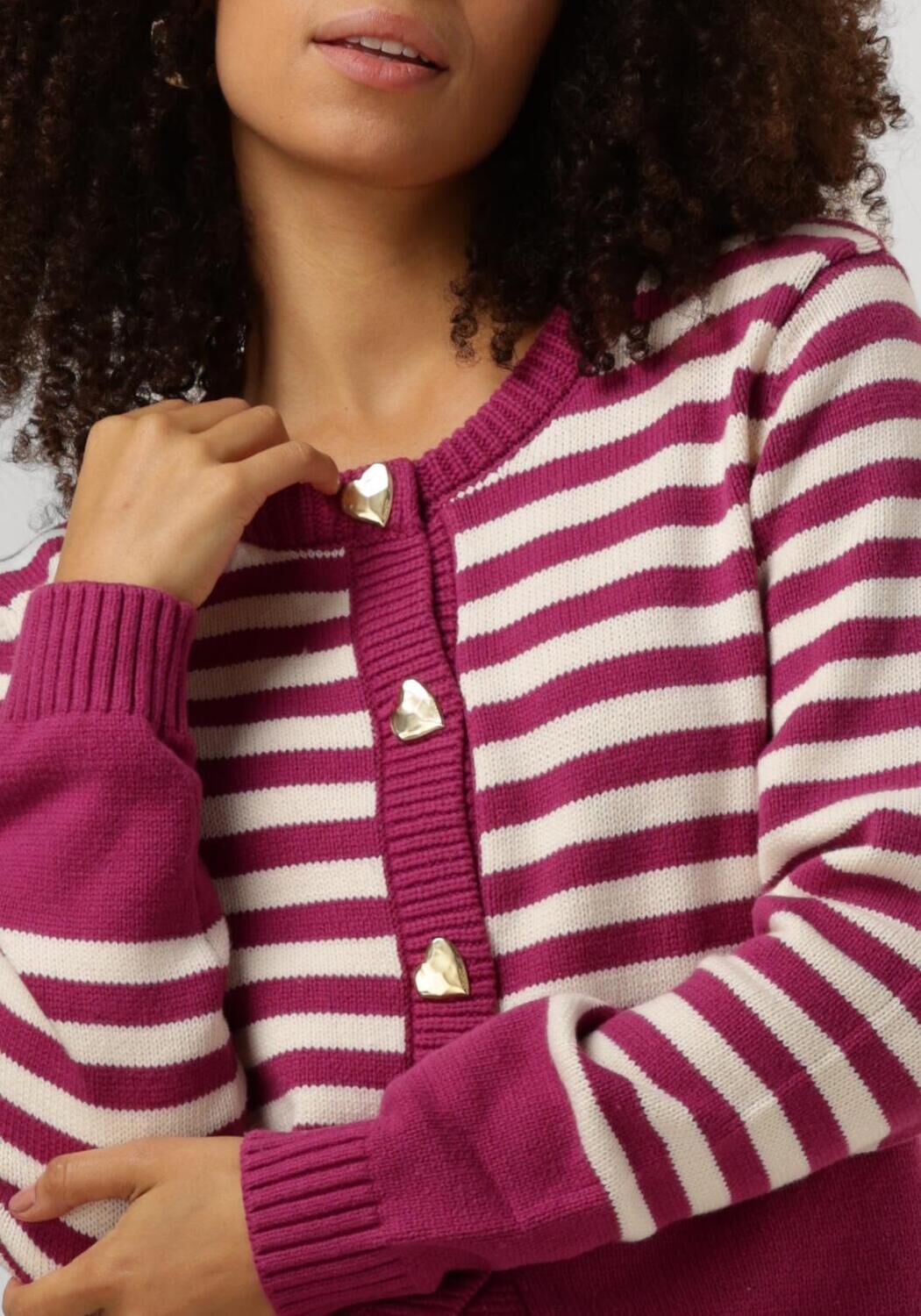 Voeg een vleugje zachtheid toe aan je garderobe met de STINE CARDIGAN van Fabienne Chapot. Dit roze vest met witte streep, gemaakt van biologisch katoen, voelt heerlijk aan op de huid en is perfect voor een dagje shoppen of een ontspannen middag in het park. De goudkleurige hartjes knopen maken dit item helemaal af! Combineer het met een lichte jeans en een paar sneakers voor een casual look, of draag het over een elegante blouse met een rok voor een chique touch. De subtiele kleur en het comfortabele materiaal maken dit vest een veelzijdige must-have voor elke dame.
