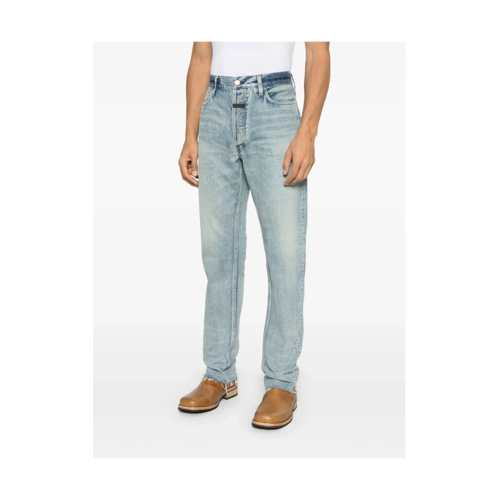 Fear Of God slim-fit jeans voor heren in blauw. Voorzien van knoopsluiting, riemlussen, logopatch aan de voorkant en toelopende pijp.