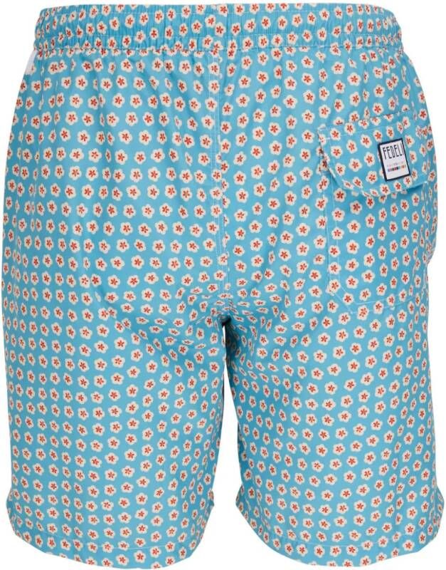 Lichtblauw, crmewit, oranje, gerecycled polyester, all-over bloemenprint, logopatch aan de achterkant, elastische tailleband met trekkoord, twee steekzijzakken, achterzak met klep, rechte zoom en dijlengte. Zwemkleding moet over je eigen kleding worden aangepast.. .
