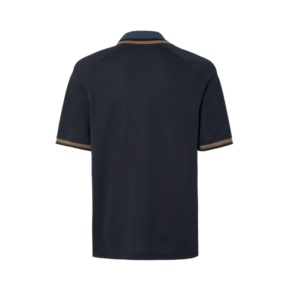 Fendi polo met korte mouwen en raglanmouwen met open V-hals kraag. Jacquard stof met donkerblauw FF motief. Geribbelde kraag en mouwen met bruin Pequin streep patroon. Voorzien van geborduurd Fendi Crest op de borst, symbool voor de honderdjarige viering van elegantie en sport van de Fendi Club.