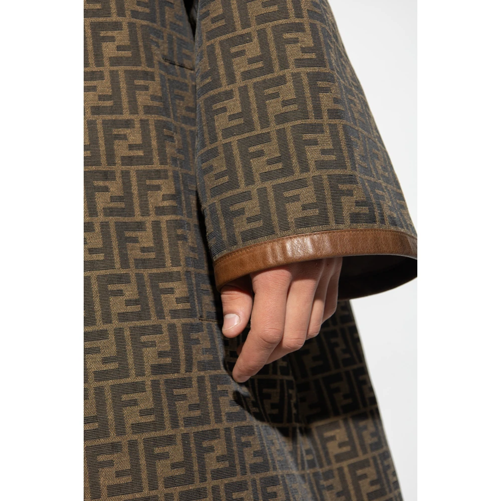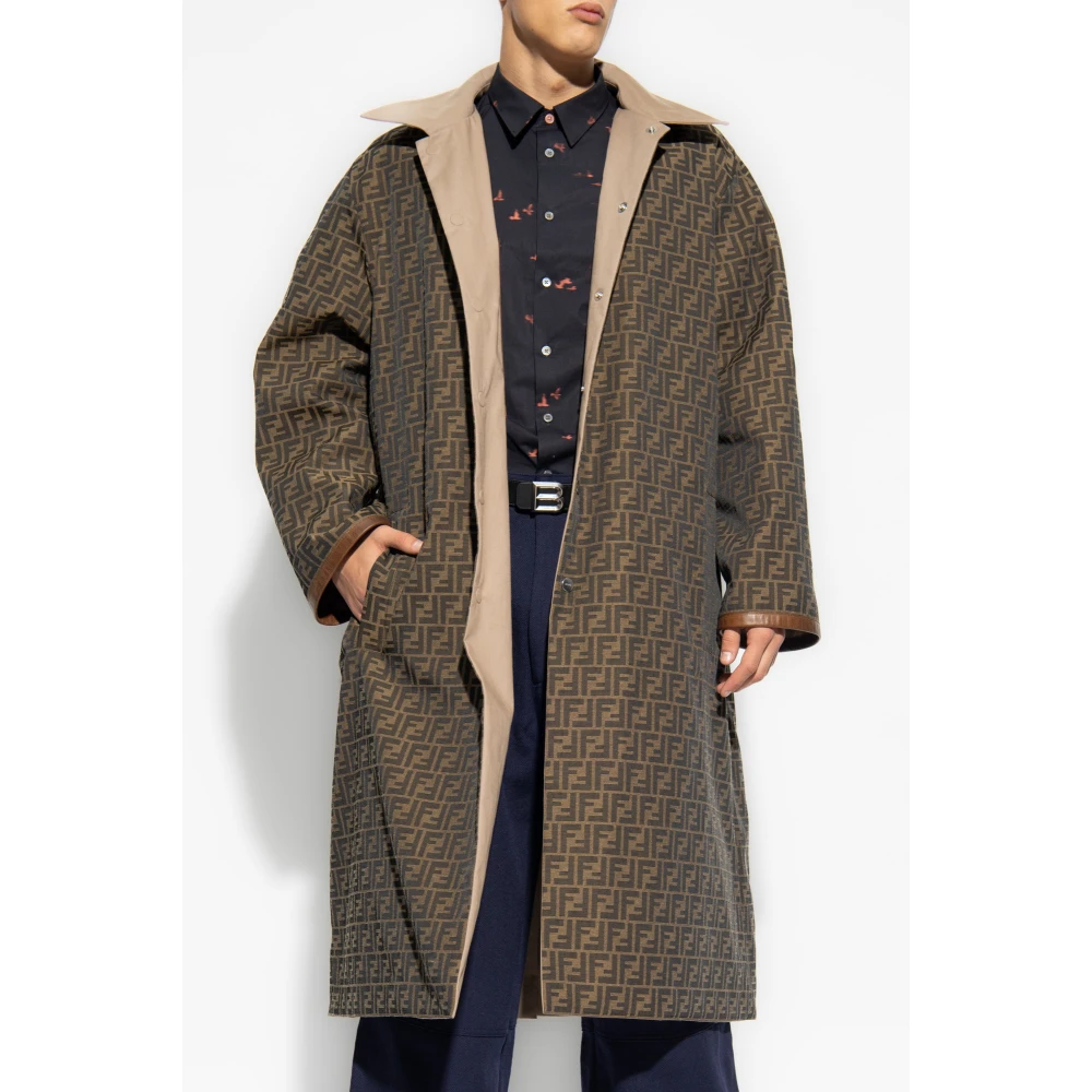 Omkeerbare jas in beige en bruin van Fendi. Dit model sluit met drukknopen en heeft een kraag, lange mouwen en een enkele split aan de achterkant. De ene kant is gemaakt van katoen en heeft drie ritszakken. De andere kant is gemaakt van gemonogrammeerd canvas en heeft twee insteekzakken. Afmetingen van het model Lengte: 193 cm Borst: 95 cm Taille: 82 cm Heupen: 93 cm Het model draagt maat: 50