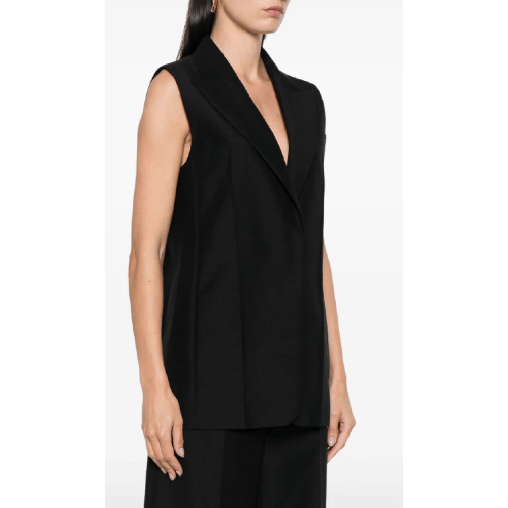 Upgrade je stijl met deze Fendi zwarte mohair-wol blend vest voor vrouwen. Met piek revers, borstzak, mouwloos ontwerp, persvouw, twee zijdelingse insteekzakken, centrale achterventilatie en verborgen knoopsluiting aan de voorkant. Gemaakt van 60% mohair en 40% wol buitenkant en 100% Cupro voering.