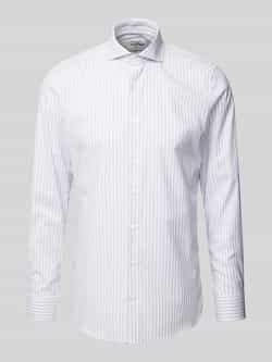 lichtblauw katoenblend verticale strepen logo applicatie geborduurde bij klassieke kraag knoopsluiting aan de voorkant verlaagde schouders korte mouwen afgeronde zoom