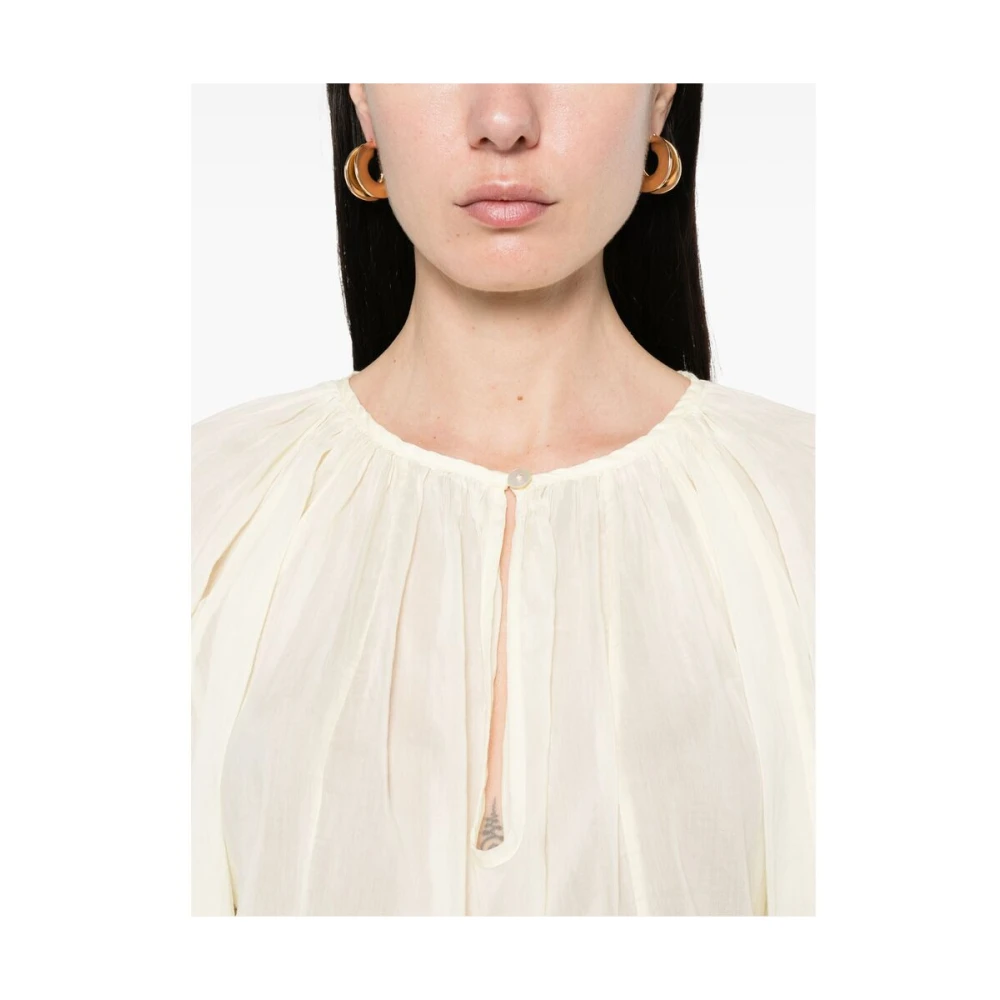 Vrouwelijke Forte Forte pastelgele blouse met knoopmanchetten, ronde hals en lange mouwen.