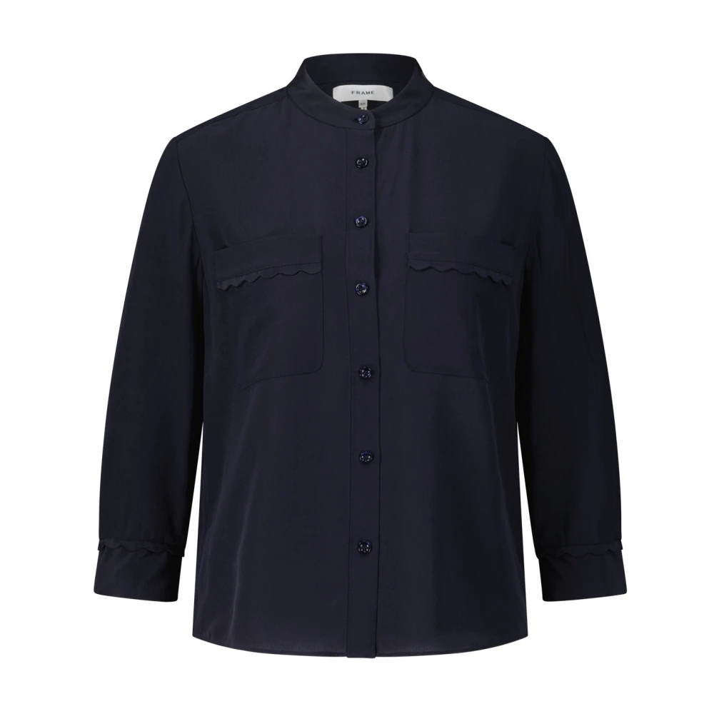 Deze blouse van Frame valt op door zijn unieke design en zachte, transparante stof. De rechte, figuurverbeterende snit, overhemdkraag en knoopsluiting maken het het ideale essentile item voor laagjesoutfits. Krijg de perfecte mix van elegantie en individualiteit in je garderobe met deze blouse