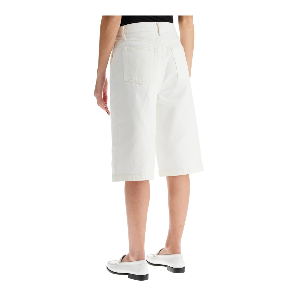 Upgrade je zomerse stijl met deze Frame high-waisted Bermuda shorts. Gemaakt van puur katoen denim, hebben deze shorts een wijde en uitlopende pijp, klassiek vijfzakkenontwerp, onzichtbare ritssluiting en knoop. Perfect voor de modebewuste vrouw, het model is 177 cm lang en draagt maat 26.