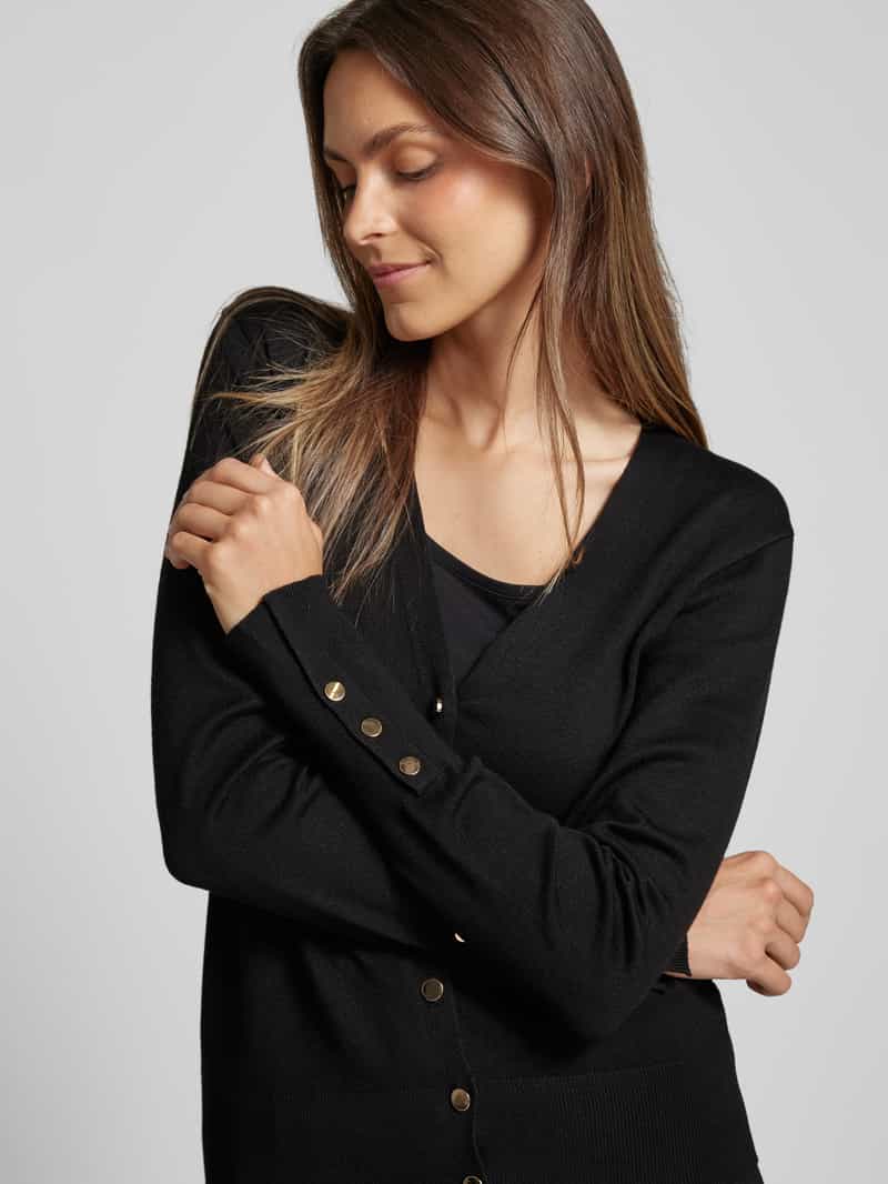 Damescardigan van FREE/QUENT. Viscosemix. Recht model. Verbrede schouders. V-hals. Knoopsluiting. Ruglengte bij maat S: 58 cm. Mouwlengte bij maat S: 64 cm