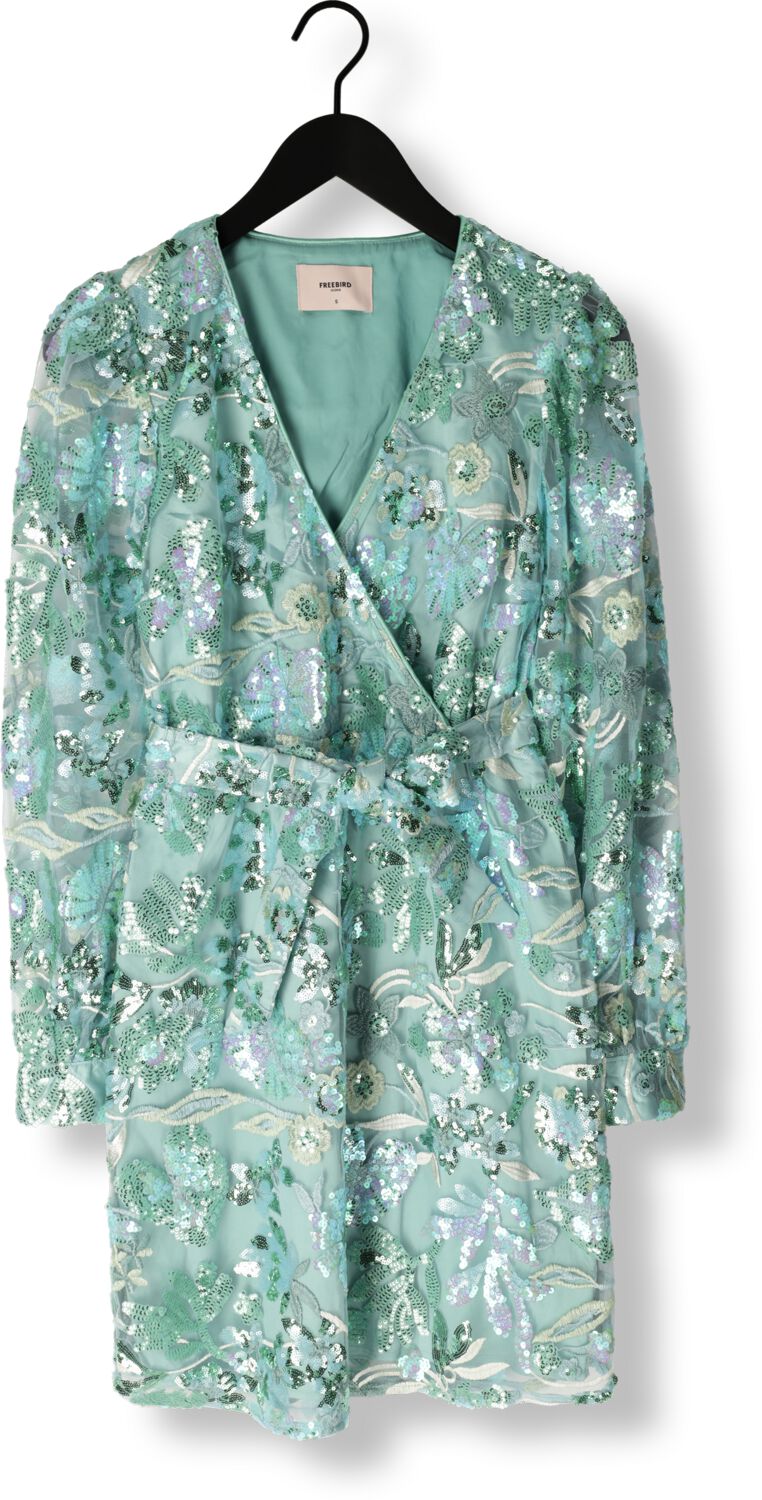 Deze damesjurk van Freebird is gemaakt van polyester en heeft een all over print. Het model beschikt over een striksluiting. De jurk met lange mouwen heeft verder een V-hals.details van deze jurk:pailletteneen ceintuur