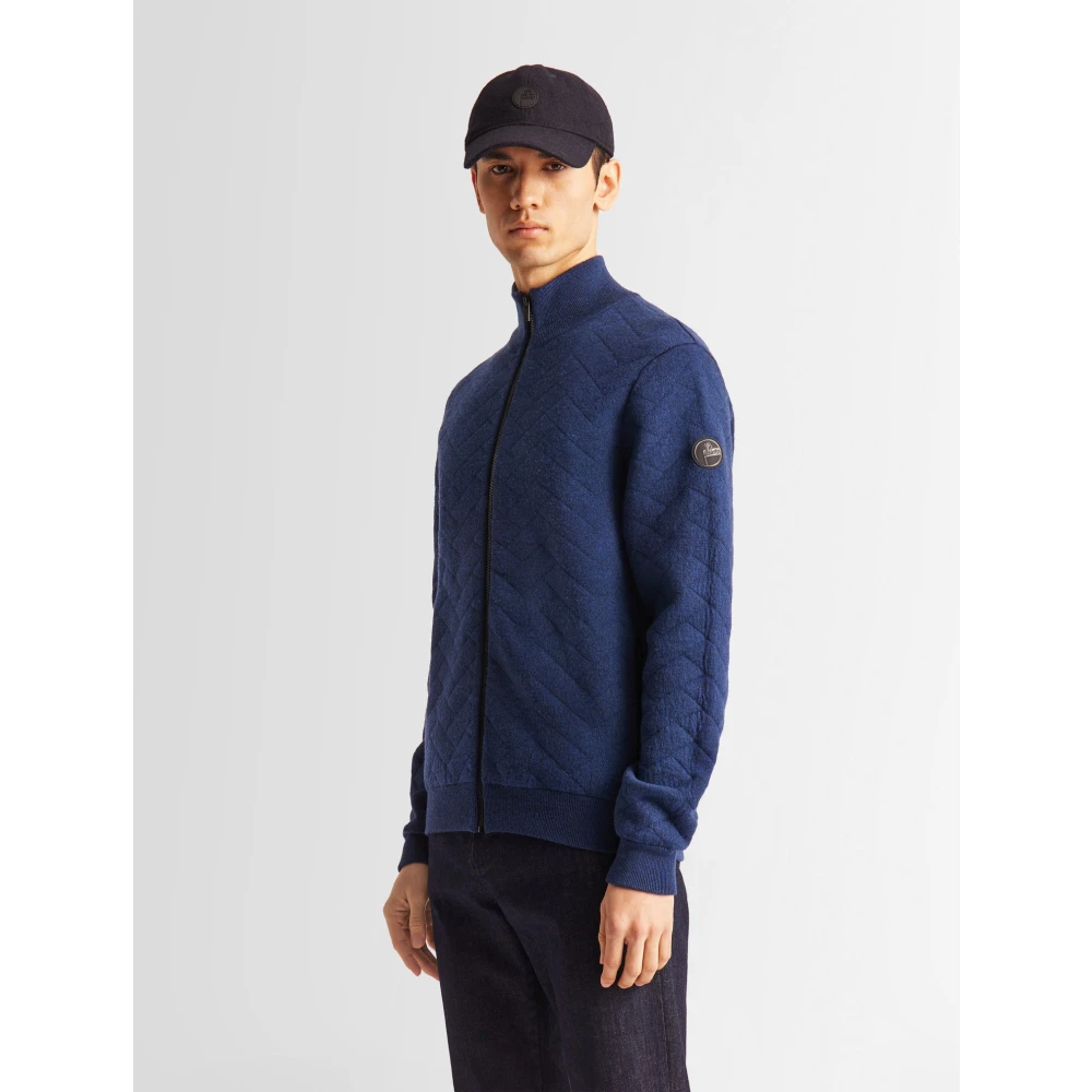 De Brieuc cardigan verleidt met zijn elegante, grafische stijl. Het is gemaakt van merinowol met het nieuwe 3D-effect koolstofpatroon genspireerd op het materiaal dat wordt gebruikt om ski's te maken. Ontworpen met een opstaande kraag, een ritssluiting aan de voorkant en ritszakken, kan deze cardigan alleen gedragen worden in het tussenseizoen of onder een jas in de winter.
