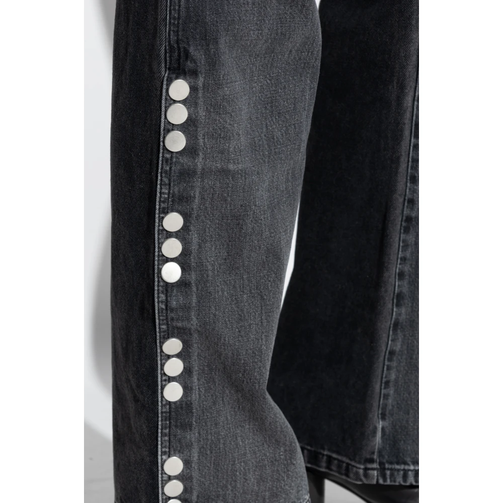 Geef je garderobe een boost met deze stijlvolle flared jeans van Gestuz, met een hoge taille en opvallende zilveren studs aan de zijkanten. Belangrijkste kenmerken: Donkergrijs | Denim | Hoge taille | Zilveren studs | Flared design | Afmetingen en pasvorm: Regular fit | Samenstelling en onderhoud: 100% Katoen | Machinewas koud, droogtrommel laag.