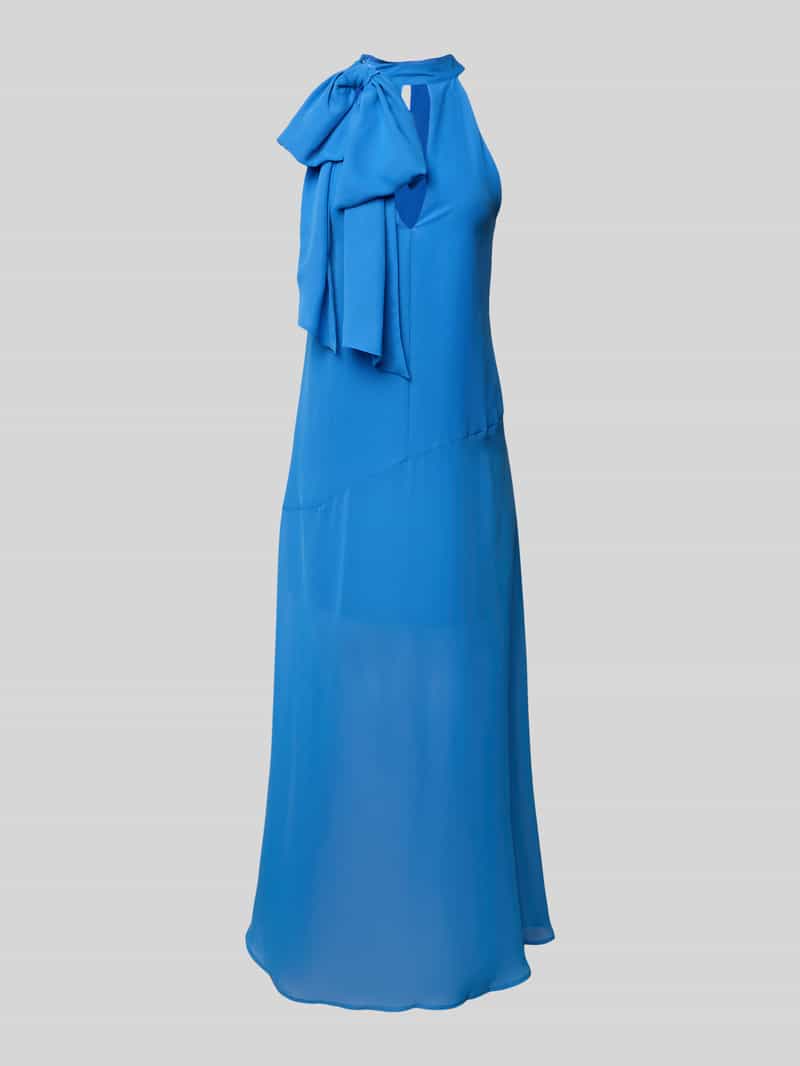 Maxi-jurk van Gestuz. Chiffon. Los model. Model 'Zsanka'. Opstaande kraag met haakjessluiting. Mouwloos design. Sierstrik. Niet-doorschijnende onderrok. Cut-out aan de voorkant. Druppelvormige hals achter. Enkelzijdige loopsplit. Ruglengte bij maat 36: 147 cm. Borstomvang bij maat 36: 47 cm