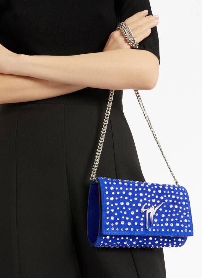 blauw sude verfraaid met kristallen logoplakkaat hoofdvak omslag met magnetische sluiting afneembare schouderband met schakels