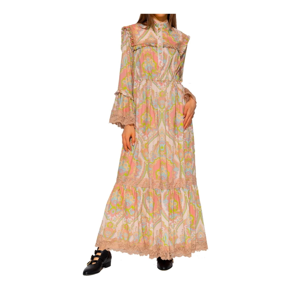 Verrijk je garderobe met deze Gucci maxi-jurk, een perfecte mix van elegantie en comfort, ideaal voor veelzijdige dag-tot-nacht gelegenheden. Belangrijkste kenmerken: Roze | Multicolor | 100% Katoen | Knoopsluiting met logo in relif | Kanten randdetail | Mandarijnkraag | Lange mouwen | Afmetingen en pasvorm: Normale pasvorm | Samenstelling en onderhoud: 100% Katoen | Uitsluitend chemisch reinigen