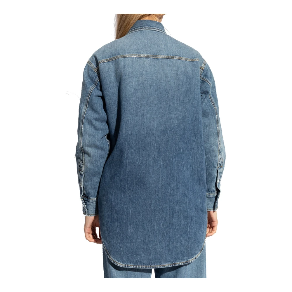 Upgrade je garderobe met deze Gucci Denim Shirt voor vrouwen. Gemaakt in Itali van 100% katoen met een polyester voering, deze losvallende shirt heeft lange mouwen, een voorzak en een afneembare messing broche versierd met kristallen. De bruine gewatteerde voering met polyester vulling voegt een vleugje luxe toe. Productcode: 772882Xdct 9_4447.