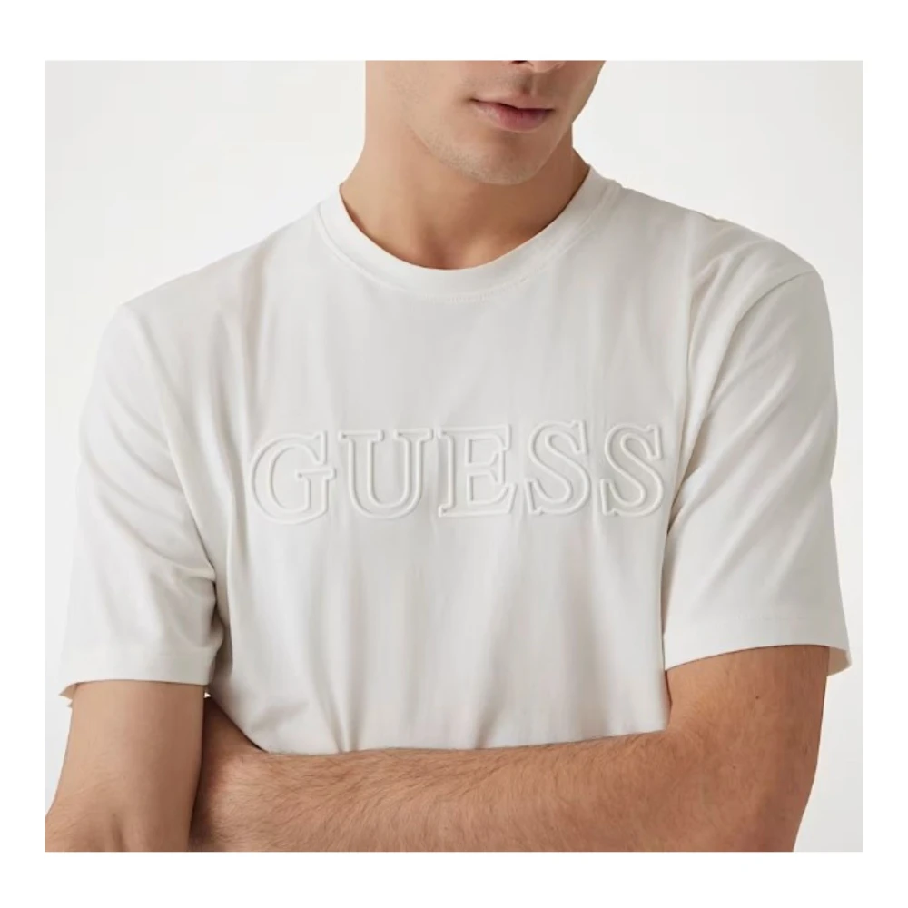 Vernieuw je casual garderobe met deze Guess T-shirt voor heren. Gemaakt van een katoenmix, het heeft een ronde hals, korte mouwen en een regular fit. Het jersey materiaal toont een logo detail aan de voorkant. Samenstelling: 95% katoen, 5% elastaan. Model is 1, 88 cm lang en draagt maat M