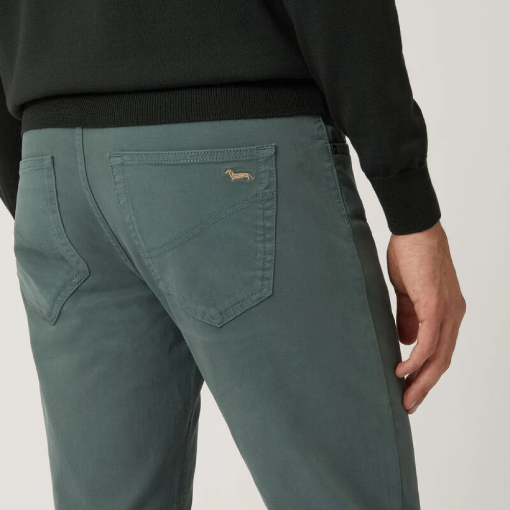 Fris ontwerp en smalle pasvorm, iets strakker en geschikt voor iets formelere looks. De broek heeft een toelopende pijp, riemlussen en een comfortabele sluiting aan de voorkant met verborgen rits en knoop. Aan de achterkant bevindt zich een merklabel, twee opgestikte zakken, waarvan n met geborduurde teckel, terwijl het voorste deel compleet is met nog twee zakken en een vijfde klein zakje. Samenstelling 98% katoen 2% elastaan.
