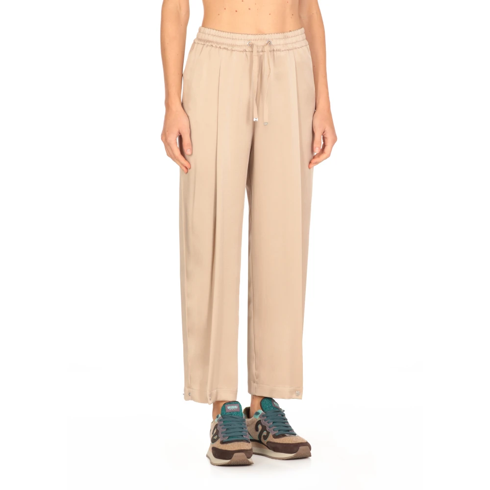 Upgrade je garderobe met deze beige Herno satijnen broek voor vrouwen. Voorzien van een elastische taille met trekkoord, twee zijdelingse steekzakken, een achterzak met paspel en knopen aan de zoom. Model is 179 cm lang en draagt maat 40.