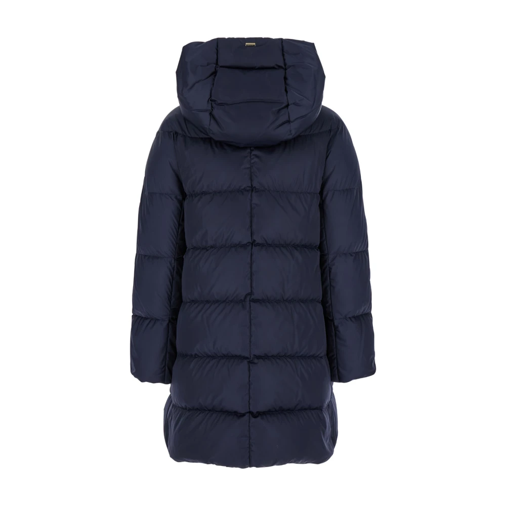Blijf warm en stijlvol in deze lange donsjas van Herno voor vrouwen. Voorzien van een vaste capuchon met trekkoord, lange mouwen met knoopmanchetten en een voorsluiting met tweewegrits. Gemaakt met goudkleurige metalen details, gevuld met dons en doorgestikt in blauw satijn. Deze parka in regular fit is perfect voor de koudere dagen.