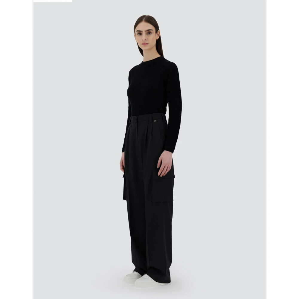 Upgrade je garderobe met Herno`s High-Waist Cargo Broek, ontworpen voor een elegante en veelzijdige look. Deze broek heeft een hoge taille en een lang, recht model, perfect voor elke gelegenheid. Belangrijkste kenmerken: Zwart | 53% Polyester, 43% Wol, 4% Elastaan | Verborgen ritssluiting en knoopsluiting | Schuine steekzakken | Cargo-zijzakken | Elastische tailleband achter | Twee paspelzakken achter | Logo-bedel aan de voorkant | Geplooide details | Persvouw | Afmetingen en pasvorm: Slim fit | Samenstelling en onderhoud: 53% Polyester | 43% Wol | 4% Elastaan | Uitsluitend chemisch reinigen