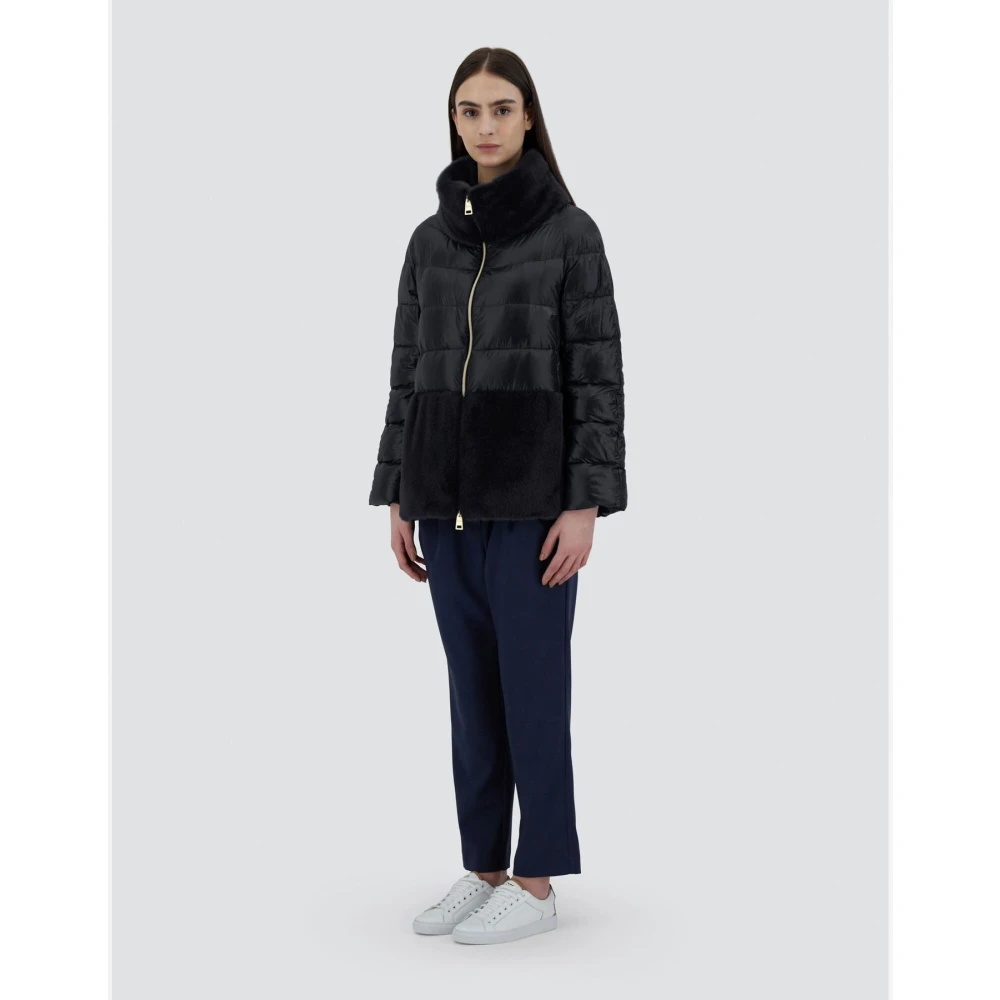 Blijf warm en stijlvol in Herno's zwarte gewatteerde en gevoerde nylon donsjack voor vrouwen. Deze jas heeft een nepbont hoge kraag en onderpaneel, dubbele ritssluiting en zijzakken met rits