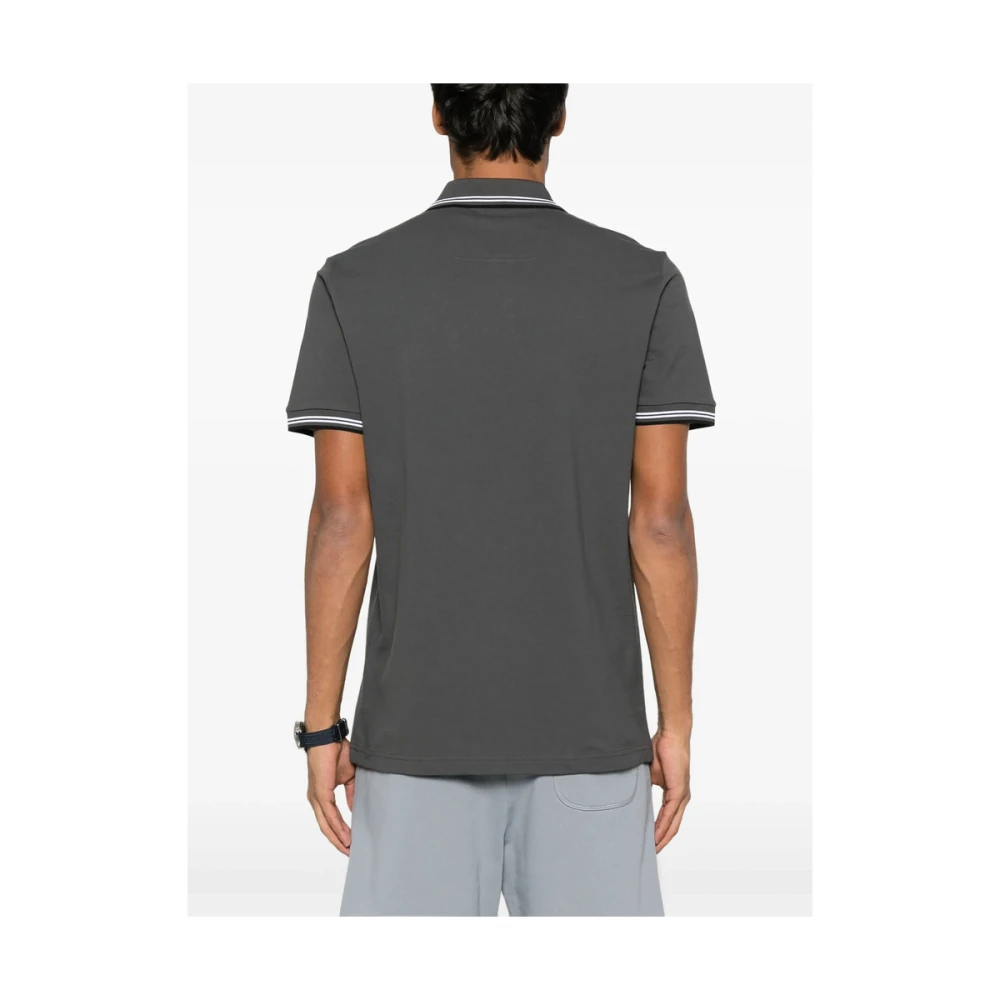 Hugo Boss antracietgrijs poloshirt voor heren met korte knoopsluiting aan de voorkant, korte mouwen en geribbelde manchetten.