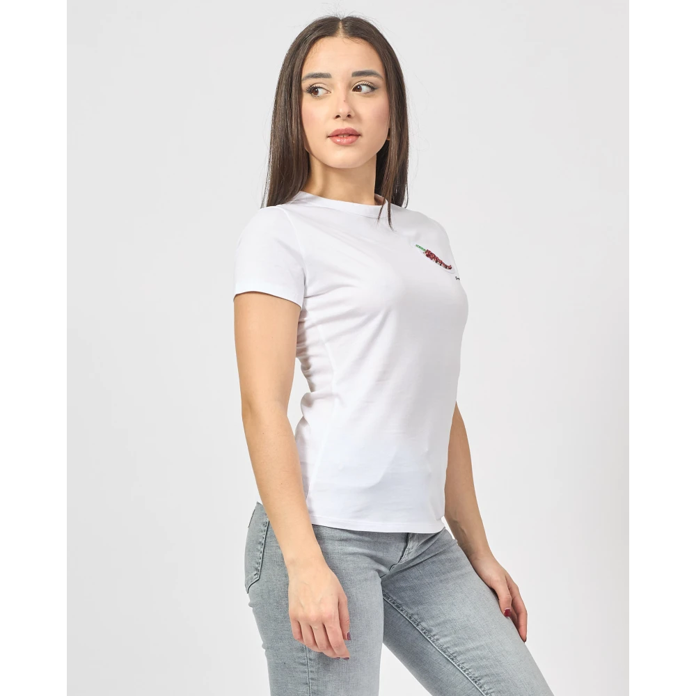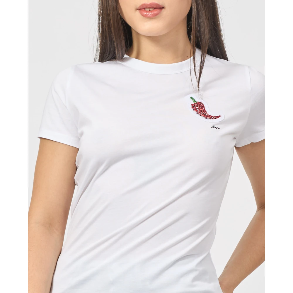 Voeg een levendige sprankeling toe aan je garderobe met deze Boss Dames T-shirt met een chili peper met kristallen. Gemaakt van ademend katoenen jersey, deze top heeft een strakke pasvorm en een taille naad die de figuur accentueert. Het model draagt maat S en is 160 cm lang.