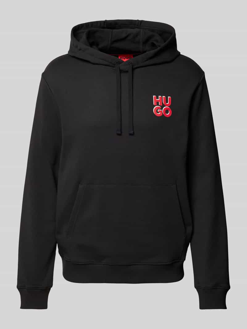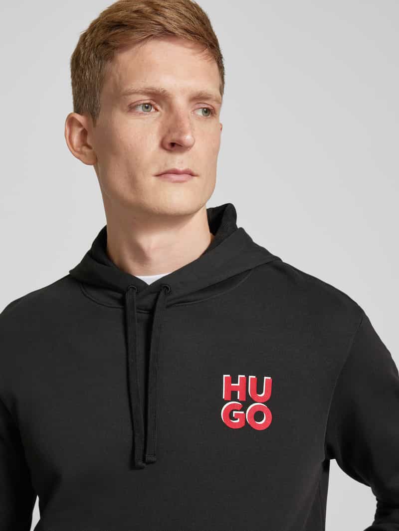 Herenhoodie van HUGO. Los model. Model 'Dimonihood'. Capuchon met tunnelkoord. Labelprint. Buidelzak. Ribboorden. Ruglengte bij maat M: 68 cm. Mouwlengte bij maat M: 69 cm