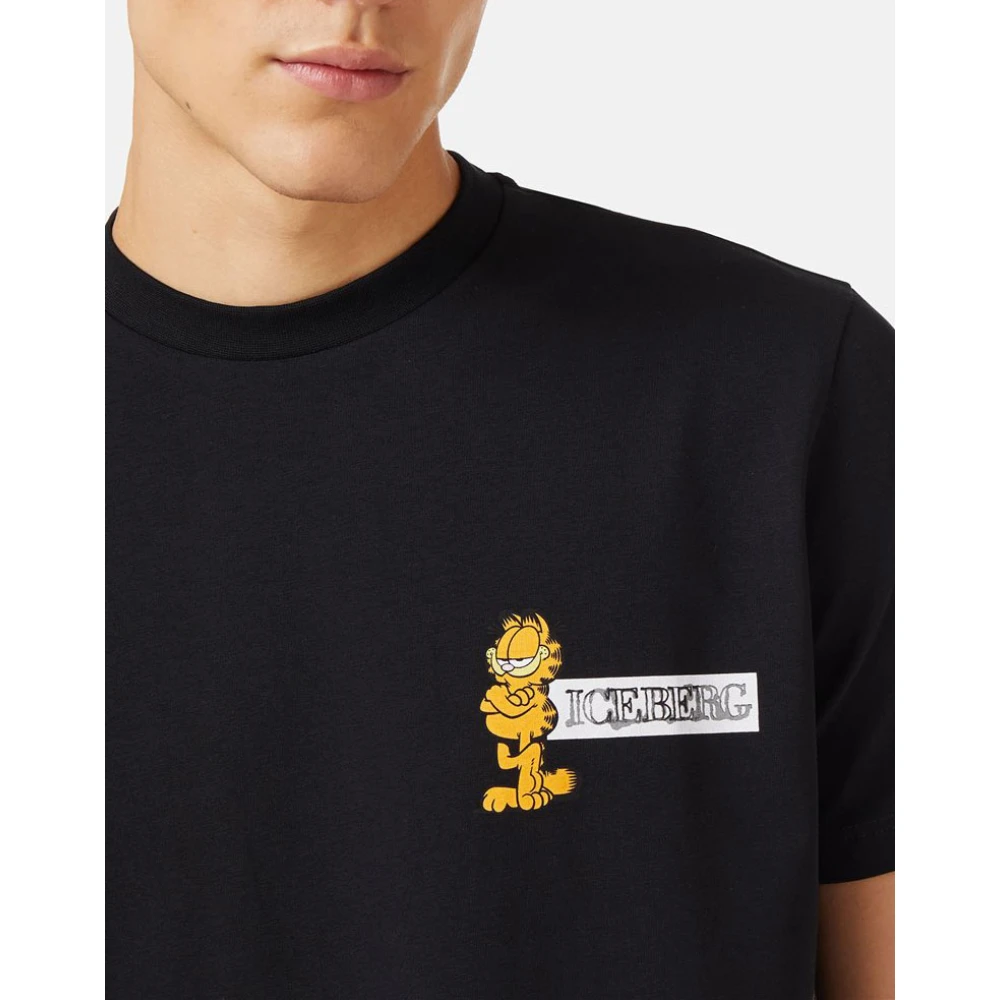 Strak zittend zwart T-shirt gemaakt van stretch jersey. Het kledingstuk heeft een Garfield-print op de voorkant en het Iceberg-logo geborduurd op de hartpositie, waarbij leuke stijl en een ecologische voetafdruk worden gecombineerd. Perfect voor een casual en bewuste uitstraling.