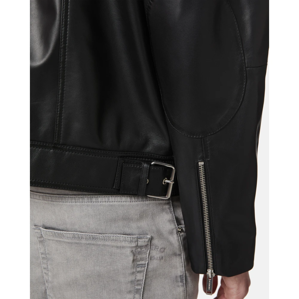Zwarte nappa leren bikerjack, een iconisch stuk dat stijl en kwaliteit combineert. Het Iceberg Milano Italia embleem in relif op de achterpas voegt een exclusieve en onderscheidende touch toe. Een jack met een rock- en verfijnde geest, perfect voor wie op zoek is naar een gedurfde en tijdloze uitstraling.
