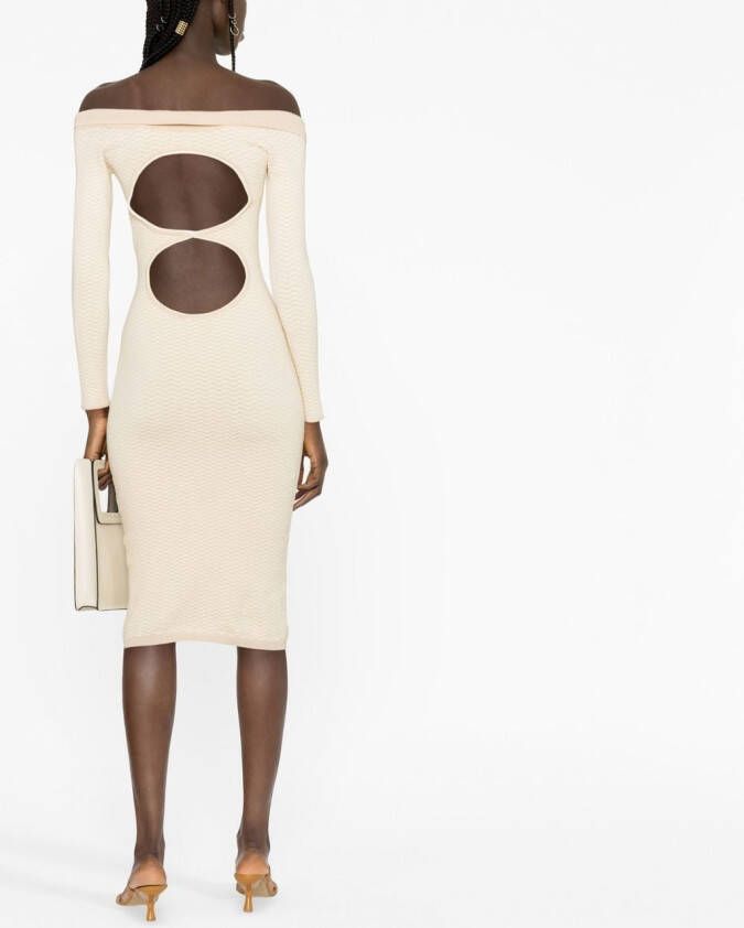 Beige, katoen, gebreid materiaal, off-shoulder, lange mouwen en uitgesneden detail .