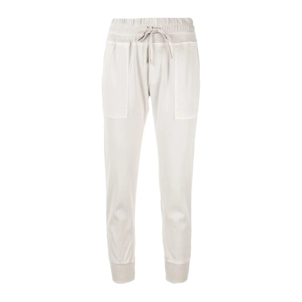 taupe grijs elastische tailleband met trekkoord twee diagonale zijzakken twee klepzakken aan de achterkant elastische enkels