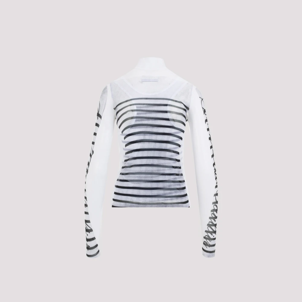 Upgrade je stijl met deze Jean Paul Gaultier longsleeve top in wit, marineblauw en zwart. Gemaakt van een mix van polyester en elasthaan, heeft deze spandex mesh top een uniek printontwerp