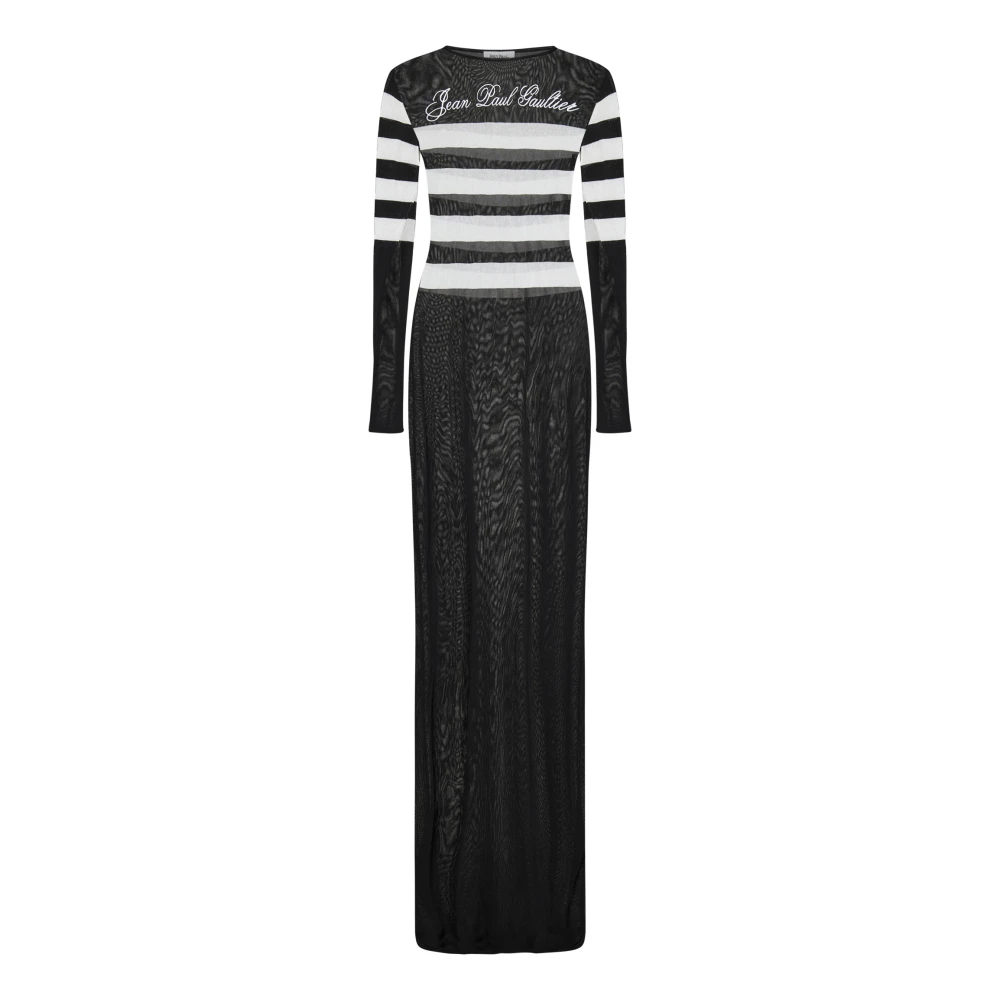 zwart/wit fijngebreid semi-doorzichtige uitvoering horizontale strepen ronde hals lange mouwen geborduurd logo op de voorkant rechte zoom lus aan de achterkant ongevoerd