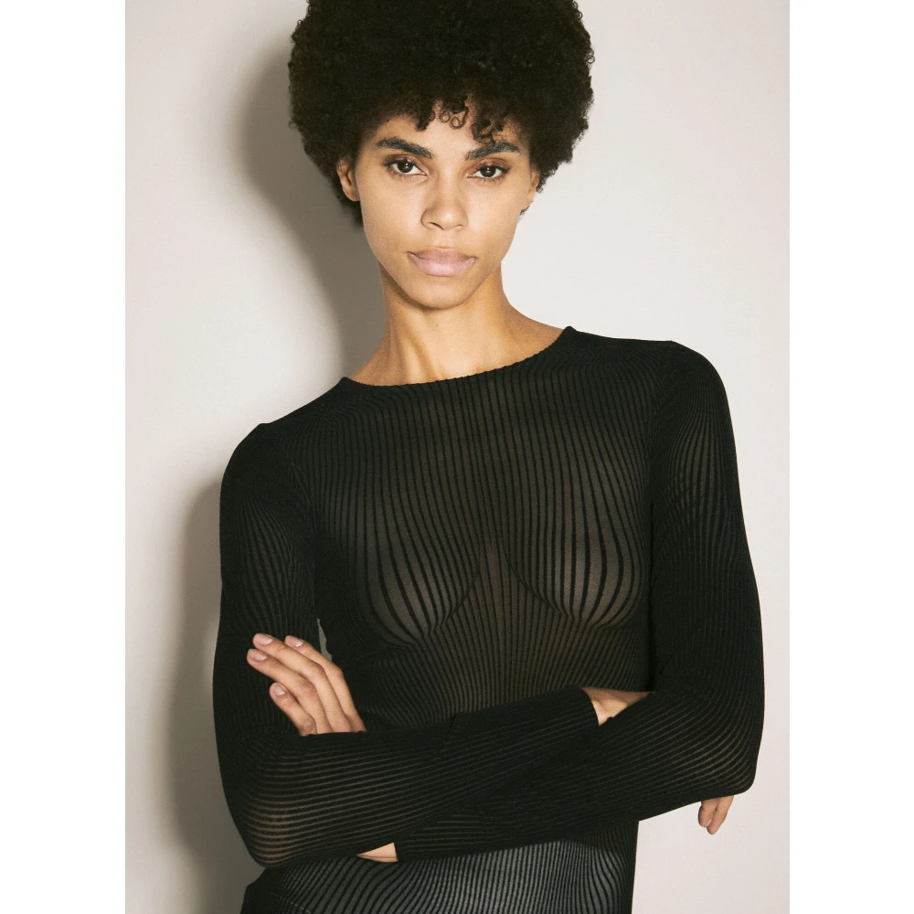 Upgrade je stijl met deze longsleeve top van Jean Paul Gaultier met een 'Morphing pinstripe' motief. Voorzien van een ronde hals, lange mouwen en een semi-transparante afwerking, is deze top een veelzijdige toevoeging aan je garderobe. Gemaakt van 96% polyester en 4% elastaan. Handwas aanbevolen.