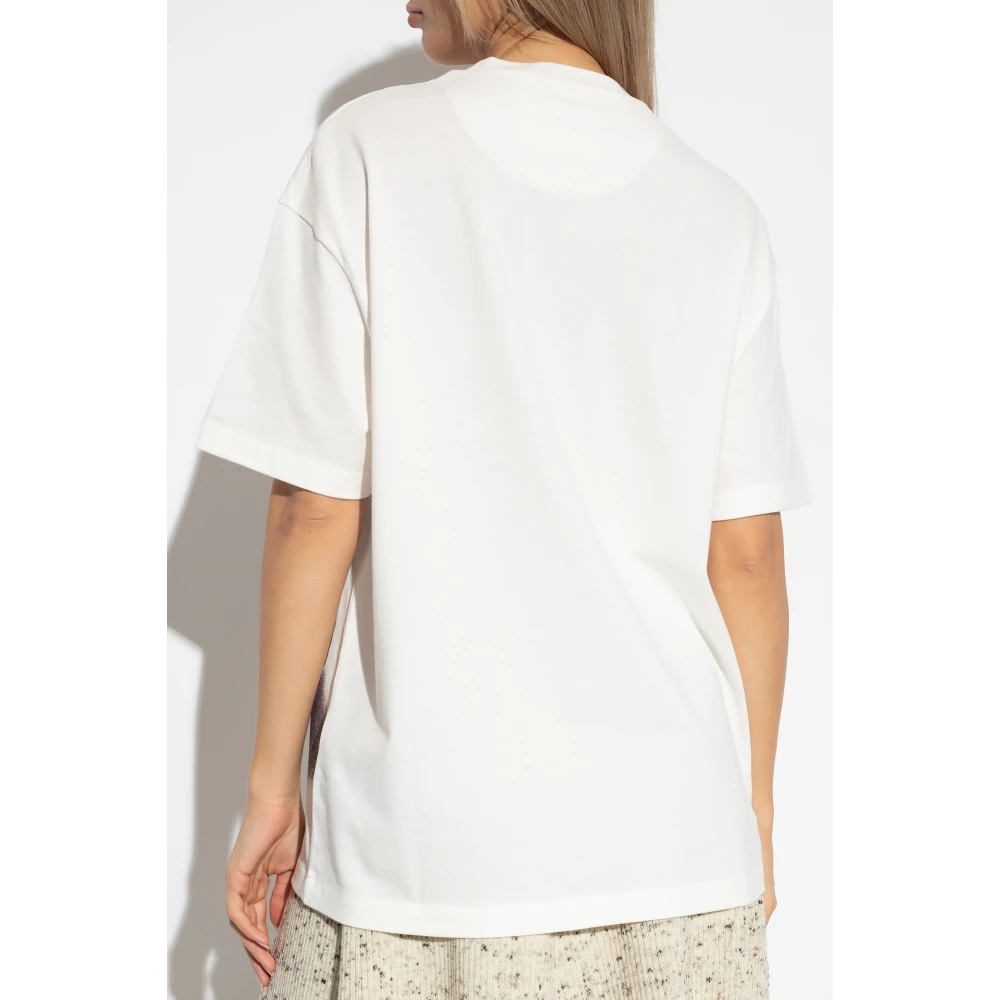 Wit T-shirt met ronde hals van JIL Sander. Gemaakt van katoen met een relaxte pasvorm, deze stijl heeft een blauwe en paarse snoepprint met een zwart logo aan de voorkant, korte mouwen en ribbels aan de kraag. Afmetingen van het model Lengte: 176 cm Borst: 85 cm Taille: 60 cm Heupen: 89 cm Het model draagt maat: XS