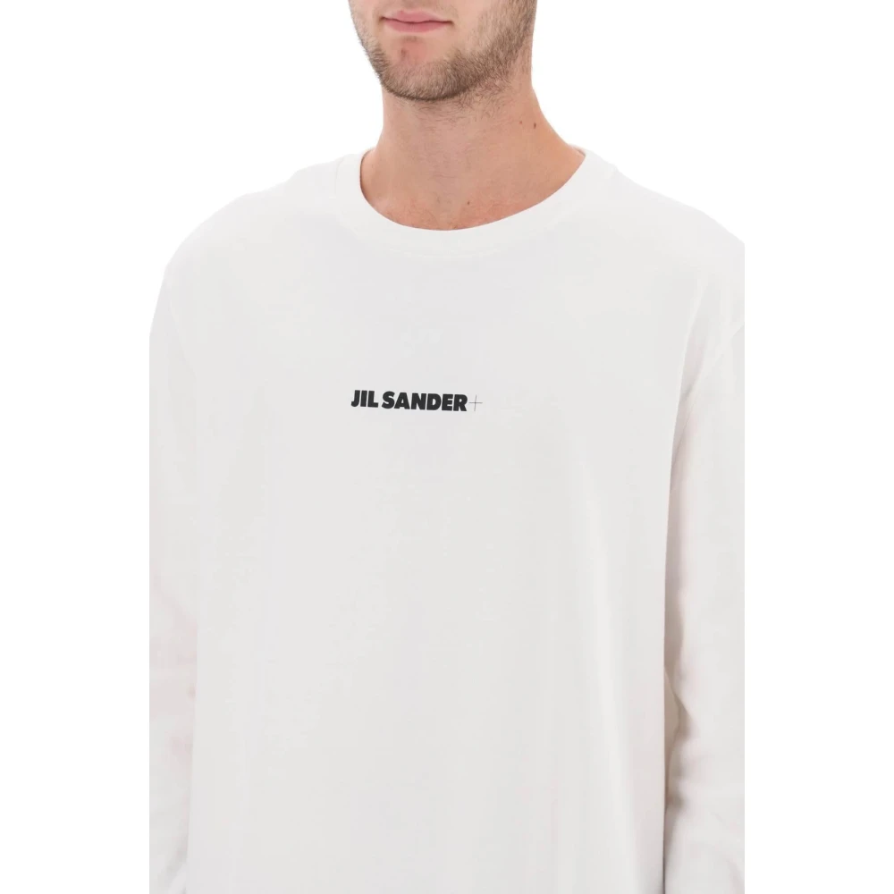 Upgrade je casual garderobe met deze Jil Sander longsleeve t-shirt voor heren. Gemaakt van hoogwaardig compact katoenen jersey, biedt het zowel comfort als stijl. De relaxte pasvorm, verlaagde schouders en geribbelde ronde hals voegen een moderne touch toe aan deze klassieke sweatshirt. Het Jil Sander+ logo gedrukt op de borst voegt een subtiel merkdetail toe. Verkrijgbaar in verschillende maten, is deze sweatshirt perfect voor dagelijks gebruik. Het model is 187 cm lang en draagt maat L.