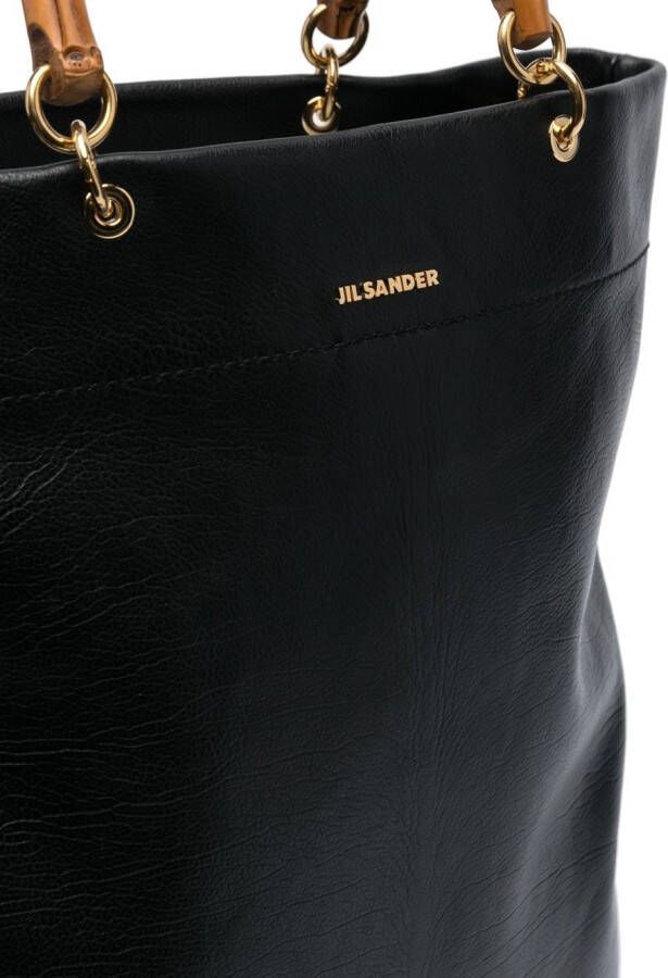 Zwart, kalfsleer, goudkleurig logo, rechthoekige vorm, twee handvatten, verborgen magneetsluiting en hoofdvak.