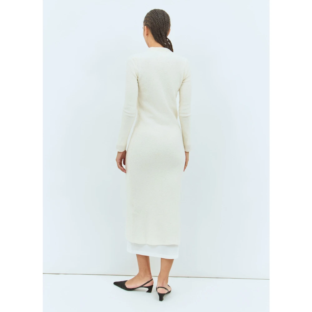 Upgrade je garderobe met deze Jil Sander midi-jurk van wol breisel. Met een ronde hals, lange mouwen en een afneembare jersey onderjurk is dit veelzijdige stuk perfect voor elke gelegenheid. Gemaakt in Itali van 100% wol. Alleen handwas.