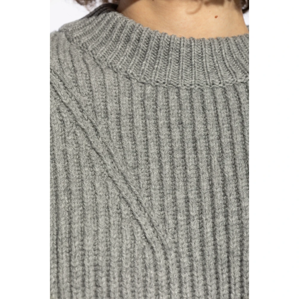 Presentatie van een grijze wollen trui van JIL Sander, die luxe minimalisme en onwankelbaar comfort belichaamt. Gemaakt van de hoogste kwaliteit 100% Wol, valt dit elegante garderobestuk op door zijn uitstekende warmte en verfijnde textuur. De geribbelde brei, prominent met een grote