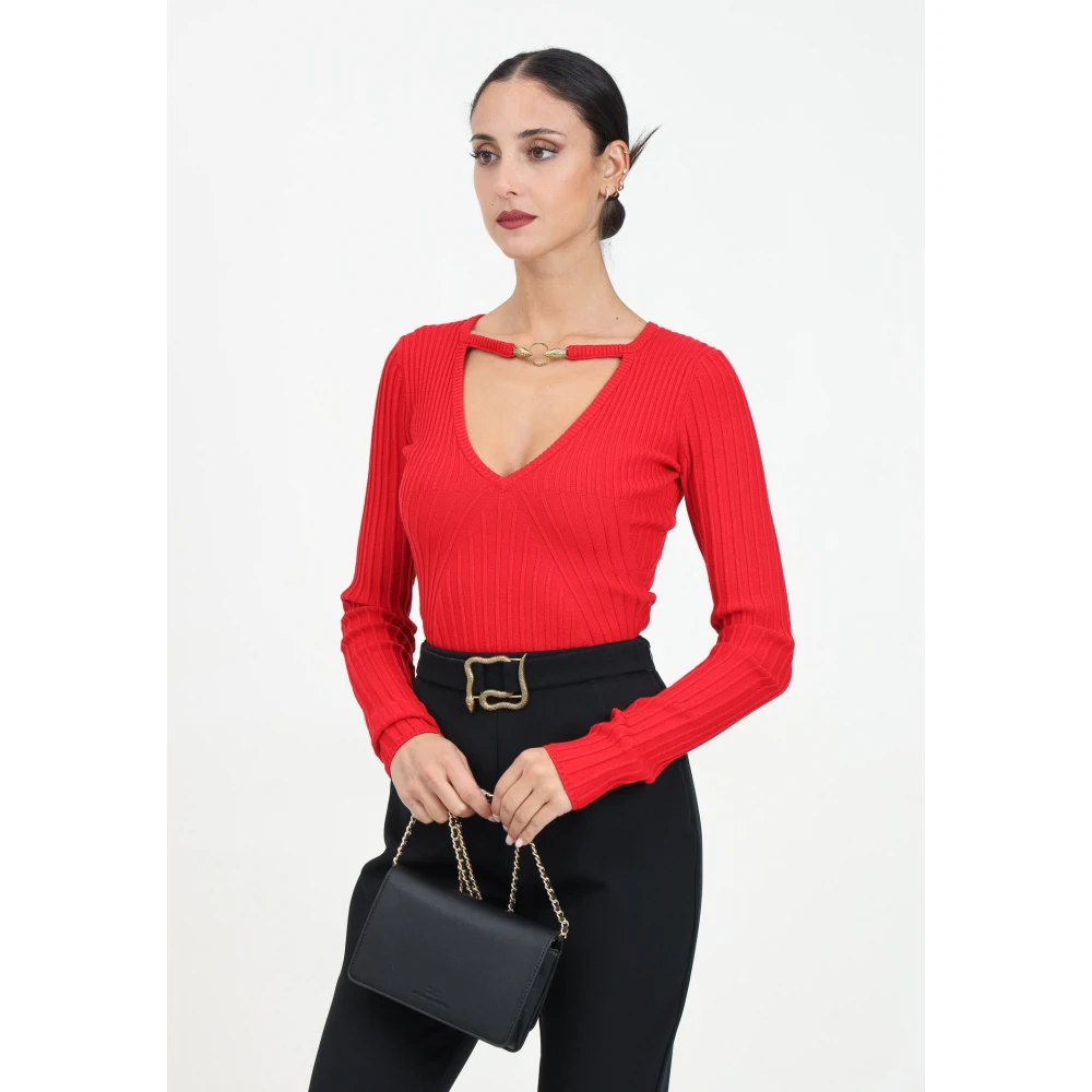 Upgrade je stijl met deze Just Cavalli rode V-hals gebreide trui voor vrouwen. Gemaakt van geribbelde stof, heeft het een gouden metalen detail dat de schouders verbindt voor een verfijnde touch. De lange mouwen voegen elegantie toe, terwijl de perfecte pasvorm je figuur flatteert. Model draagt maat S en is 170 cm lang. Handwas aanbevolen. Stof: 72% Viscose 28% Polyester. Ideaal voor herfst/winter seizoen. Regular fit dames rode V-hals gebreide trui voor herfst/winter 77Pafm 36Cmh 56573.